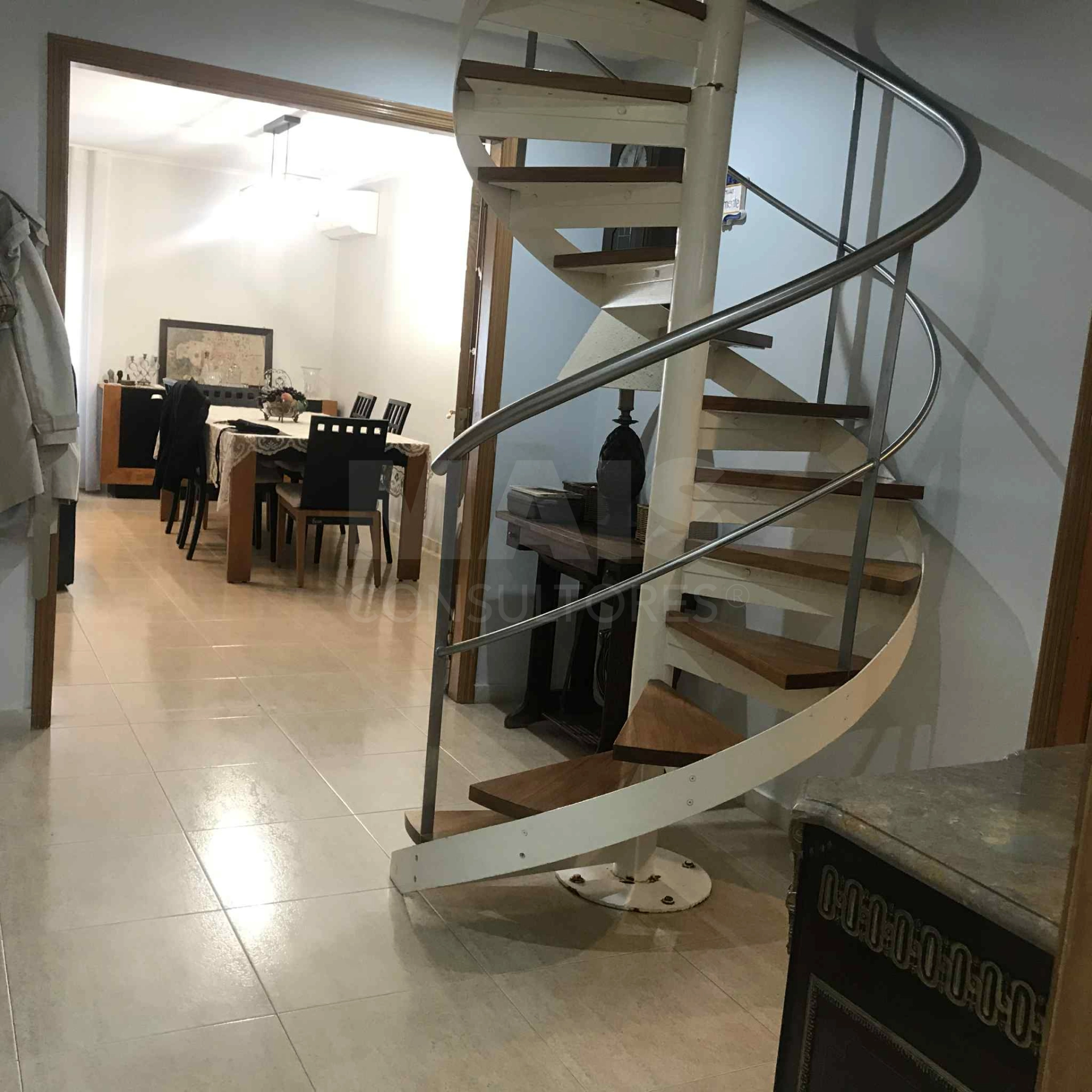 Hall de entrada com escadas em caracol para acesso ao piso superior.